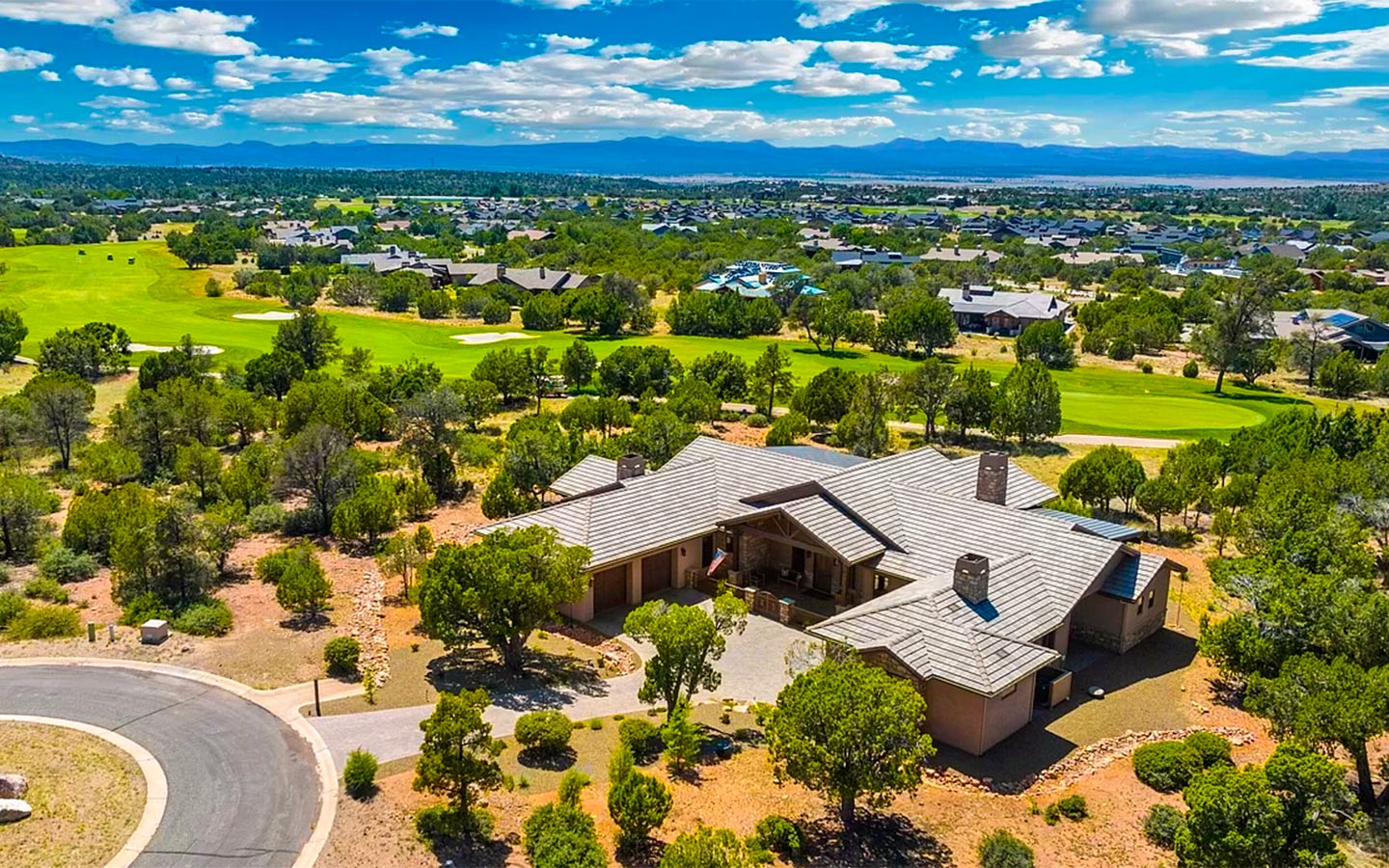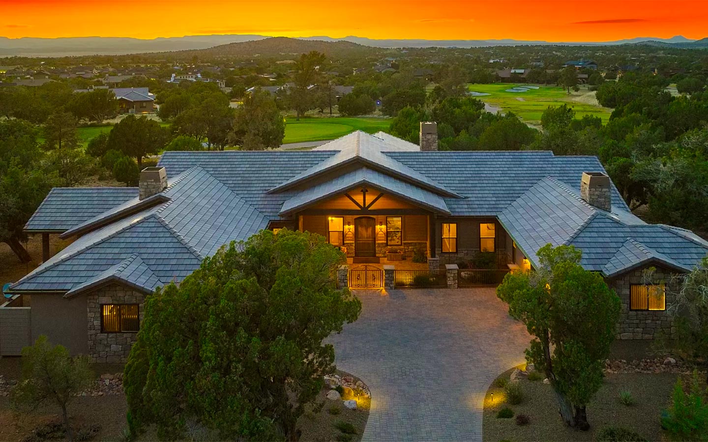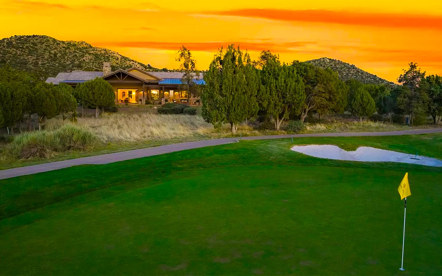 Kokopelli is a ranch-style custom home in Talking Rock Ranch, designed for people who want to live on the golf course as much as they live indoors. Set along the fairway in Prescott, AZ, the home frames big sky sunsets and long views of the greens with a single-level floor plan tailored to the owners’ lifestyle. A paver driveway leads to a welcoming motor court with stone accents, timber beams, and warm exterior lighting, while deep covered porches create shaded outdoor rooms for morning coffee, happy hour, and evenings around the grill.