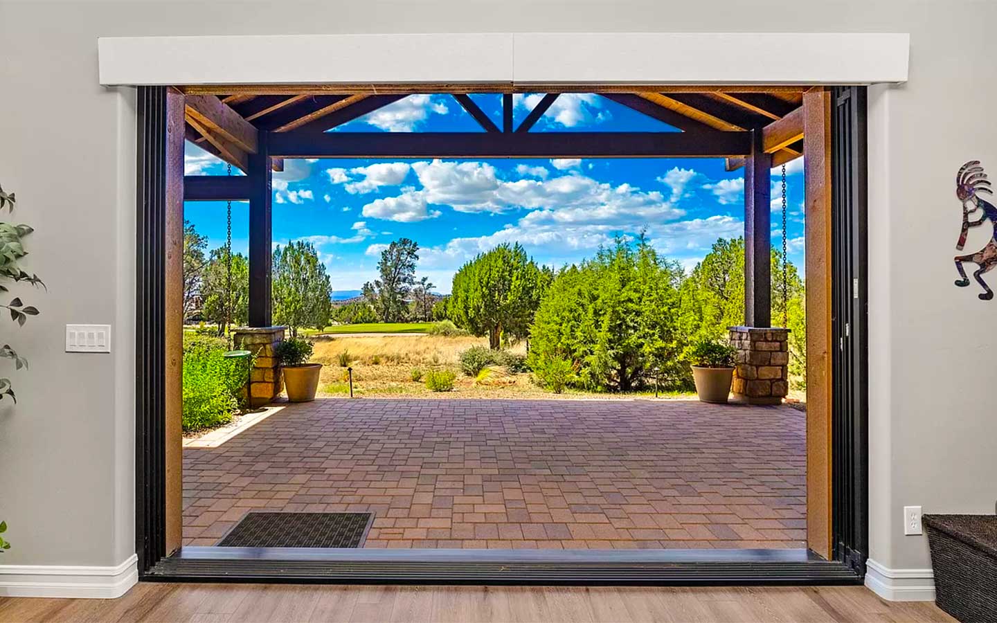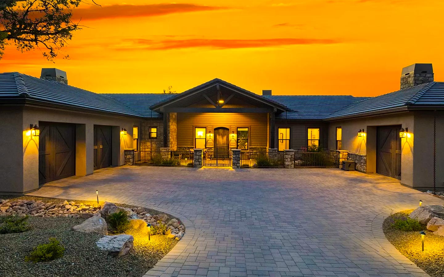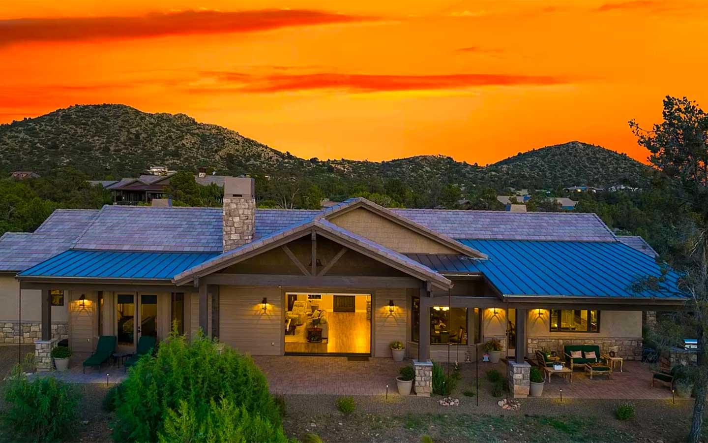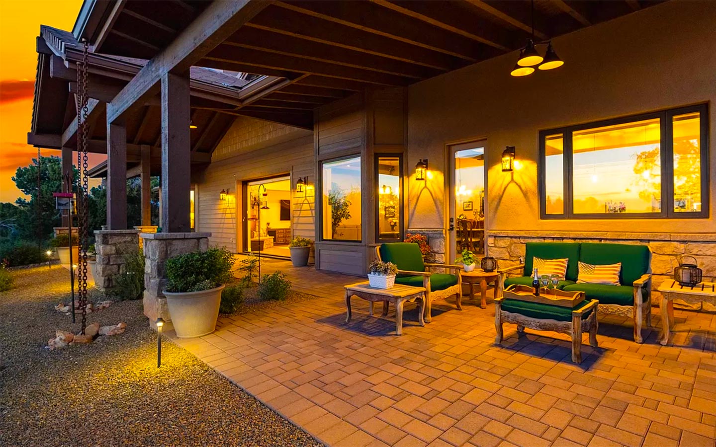 Kokopelli is a ranch-style custom home in Talking Rock Ranch, designed for people who want to live on the golf course as much as they live indoors. Set along the fairway in Prescott, AZ, the home frames big sky sunsets and long views of the greens with a single-level floor plan tailored to the owners’ lifestyle. A paver driveway leads to a welcoming motor court with stone accents, timber beams, and warm exterior lighting, while deep covered porches create shaded outdoor rooms for morning coffee, happy hour, and evenings around the grill.