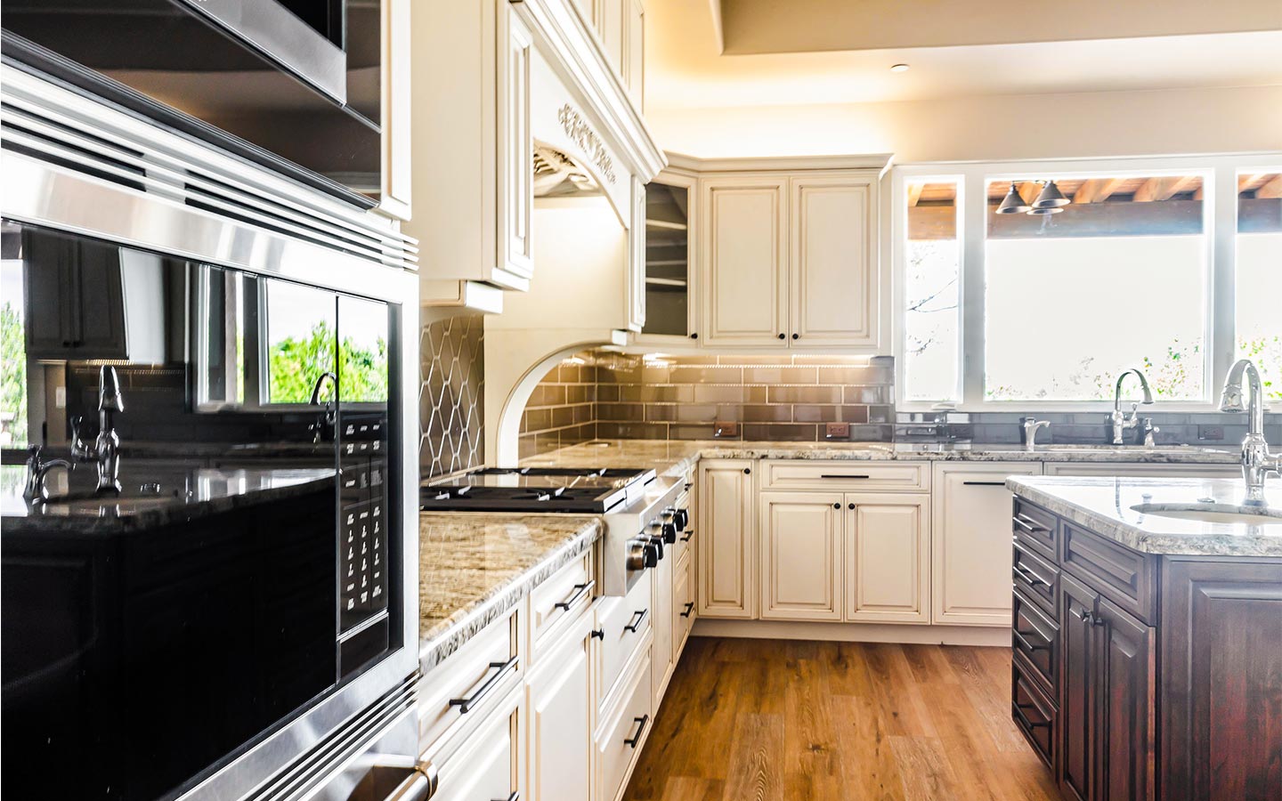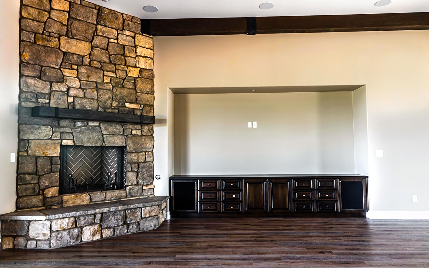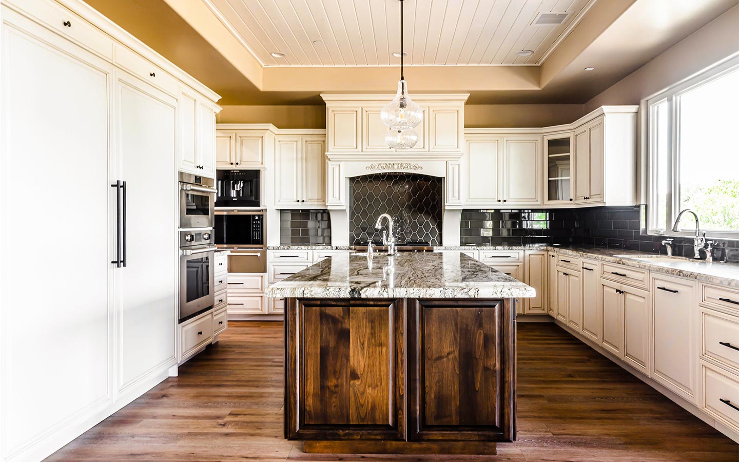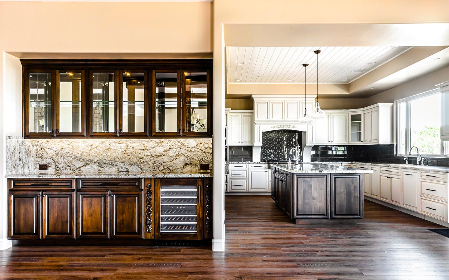 Inside, the great room anchors the home with wide-plank wood floors, exposed beams, and a stone fireplace that opens to the back patio through a full wall of glass. A chef’s kitchen with dual islands, custom cabinetry, Thermador appliances, and a butler’s pantry flows into an elegant bar for entertaining. The primary suite features furniture-style vanities, custom tile showers with layered accent bands, and a generous walk-in closet, while secondary suites and a hardworking laundry room keep everyday living comfortable and organized.