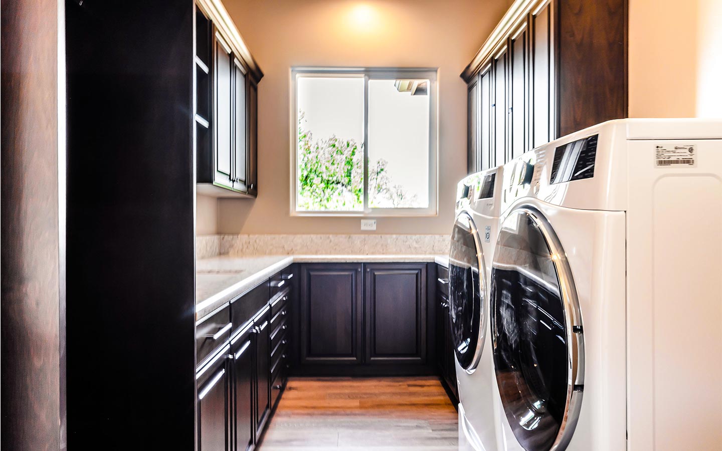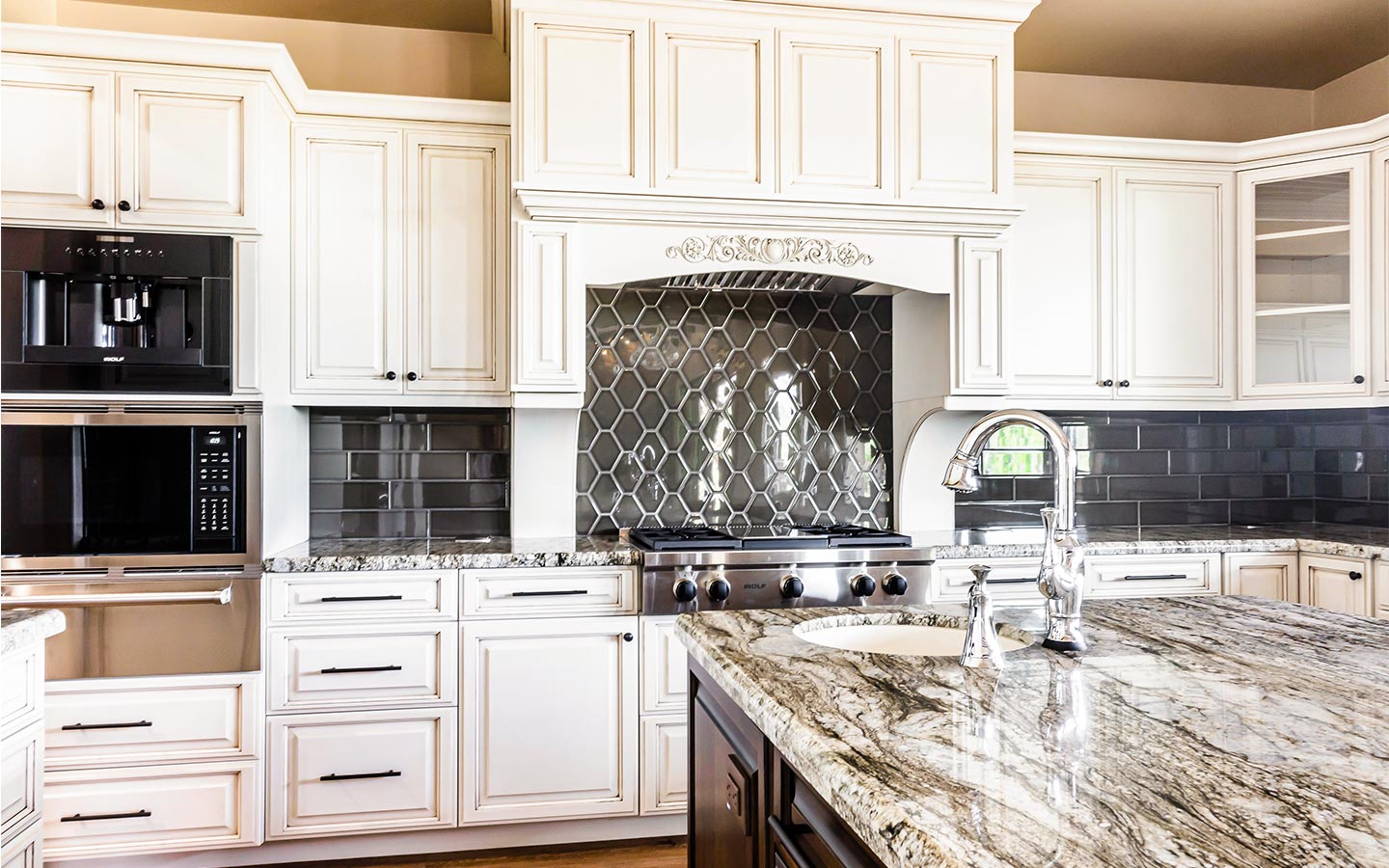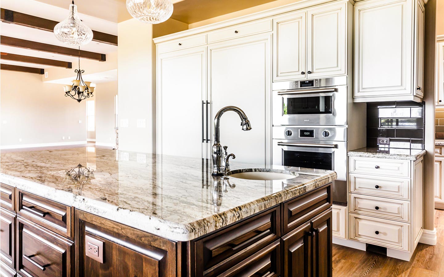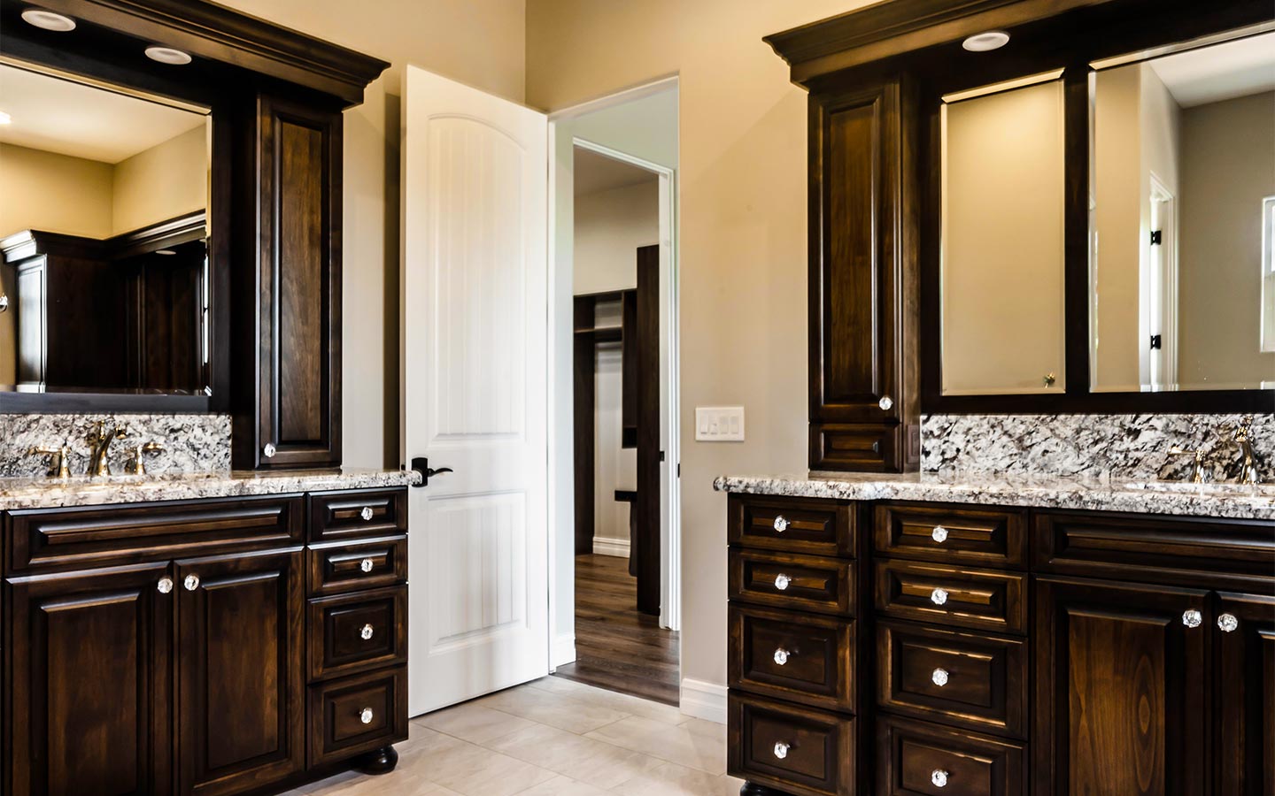 Inside, the great room anchors the home with wide-plank wood floors, exposed beams, and a stone fireplace that opens to the back patio through a full wall of glass. A chef’s kitchen with dual islands, custom cabinetry, Thermador appliances, and a butler’s pantry flows into an elegant bar for entertaining. The primary suite features furniture-style vanities, custom tile showers with layered accent bands, and a generous walk-in closet, while secondary suites and a hardworking laundry room keep everyday living comfortable and organized.
