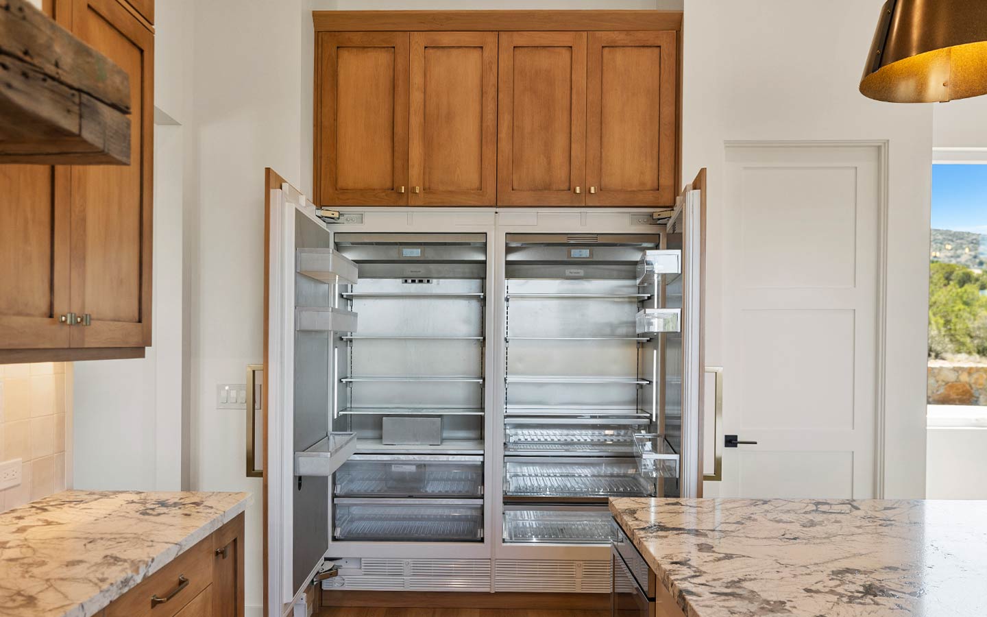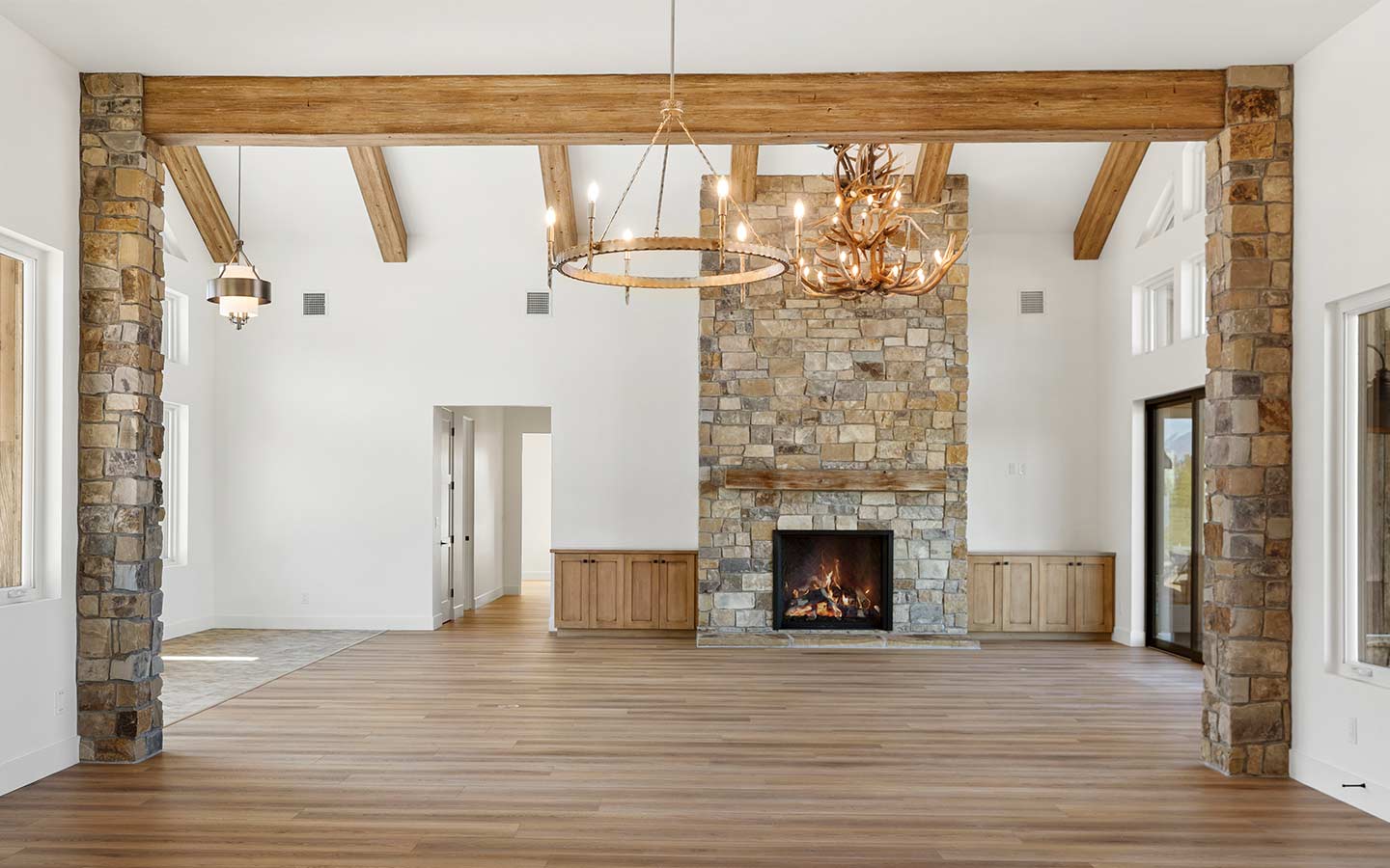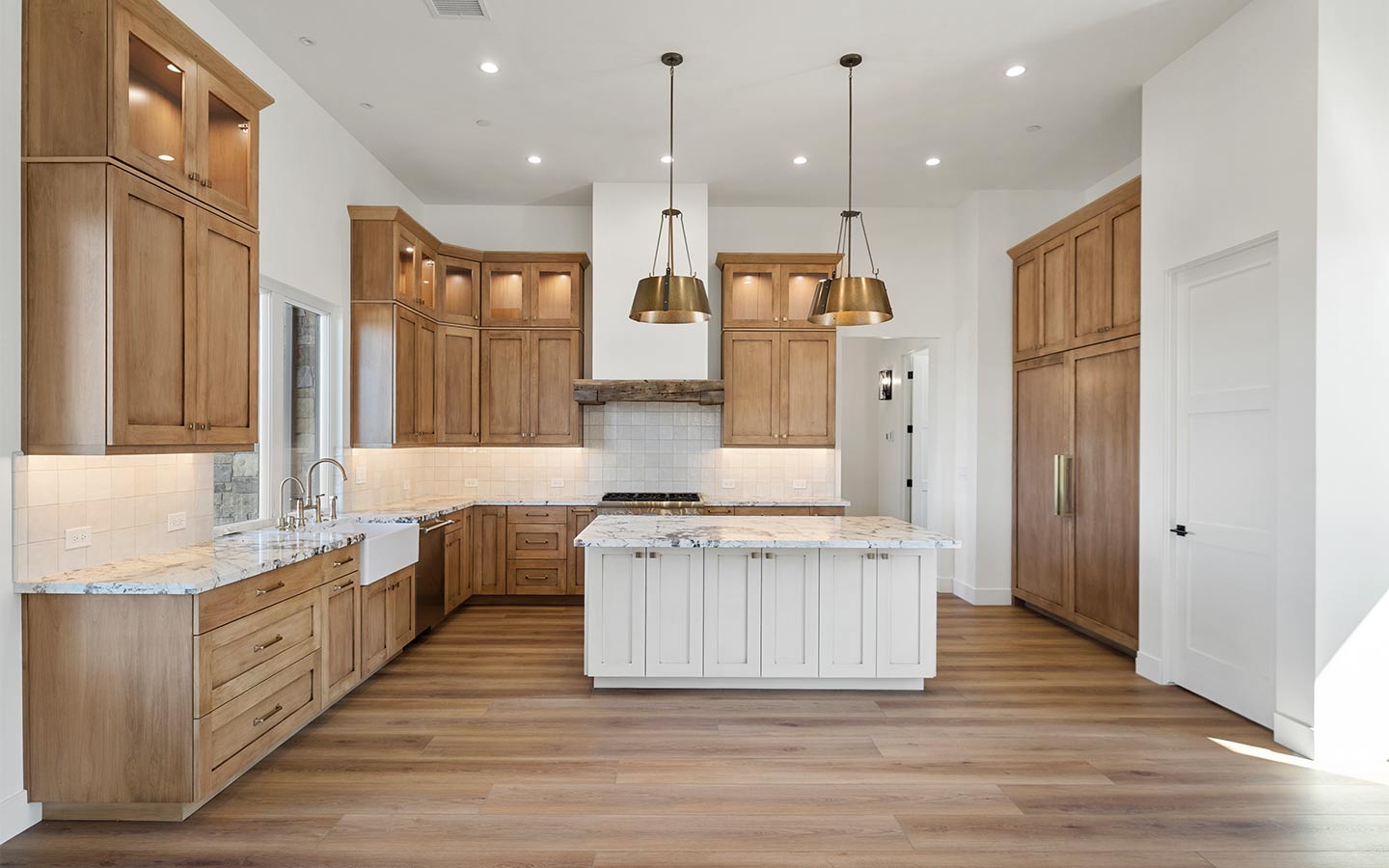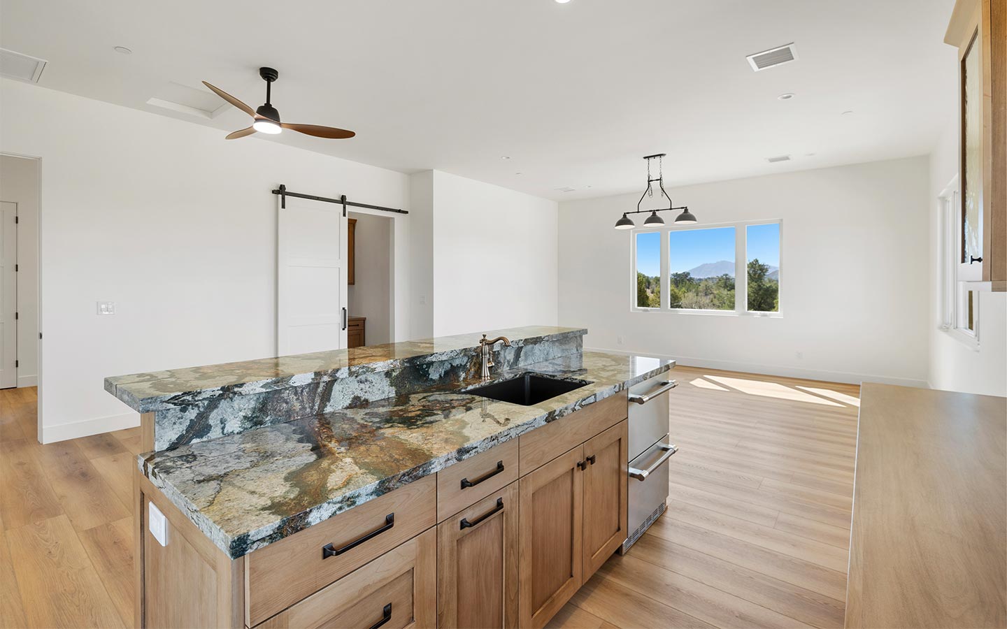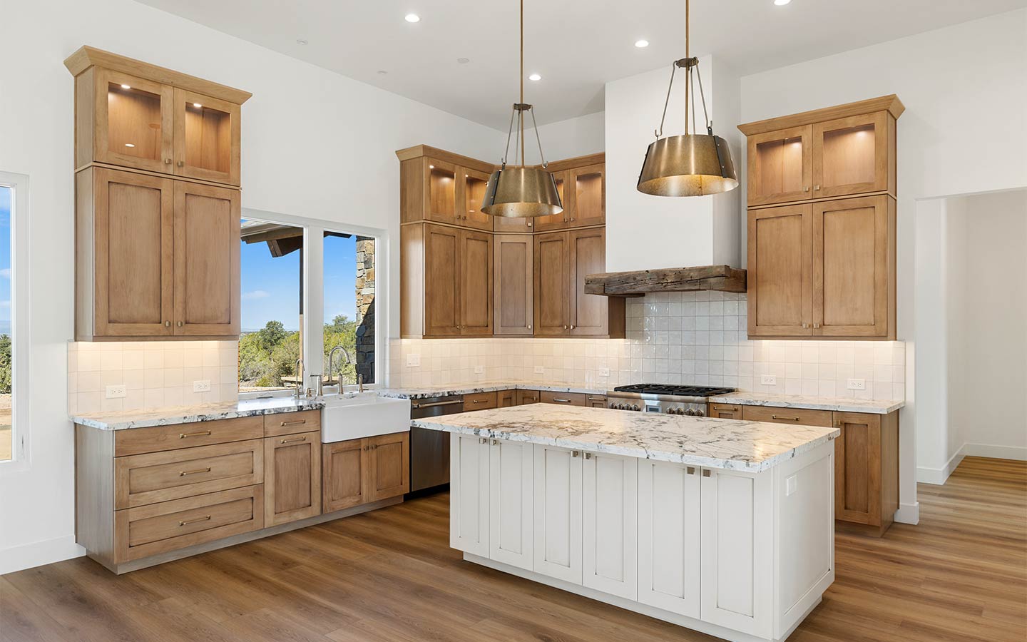 Inside, the floorplan is built around the way people actually live: a generous great room for gathering, a kitchen that works hard (and looks good doing it), and thoughtful built-ins that keep daily life organized. Big windows pull in the views and natural light, while covered outdoor transitions make the home feel connected to the landscape. All these work together to make this custom home calm, private, and easy to settle into.